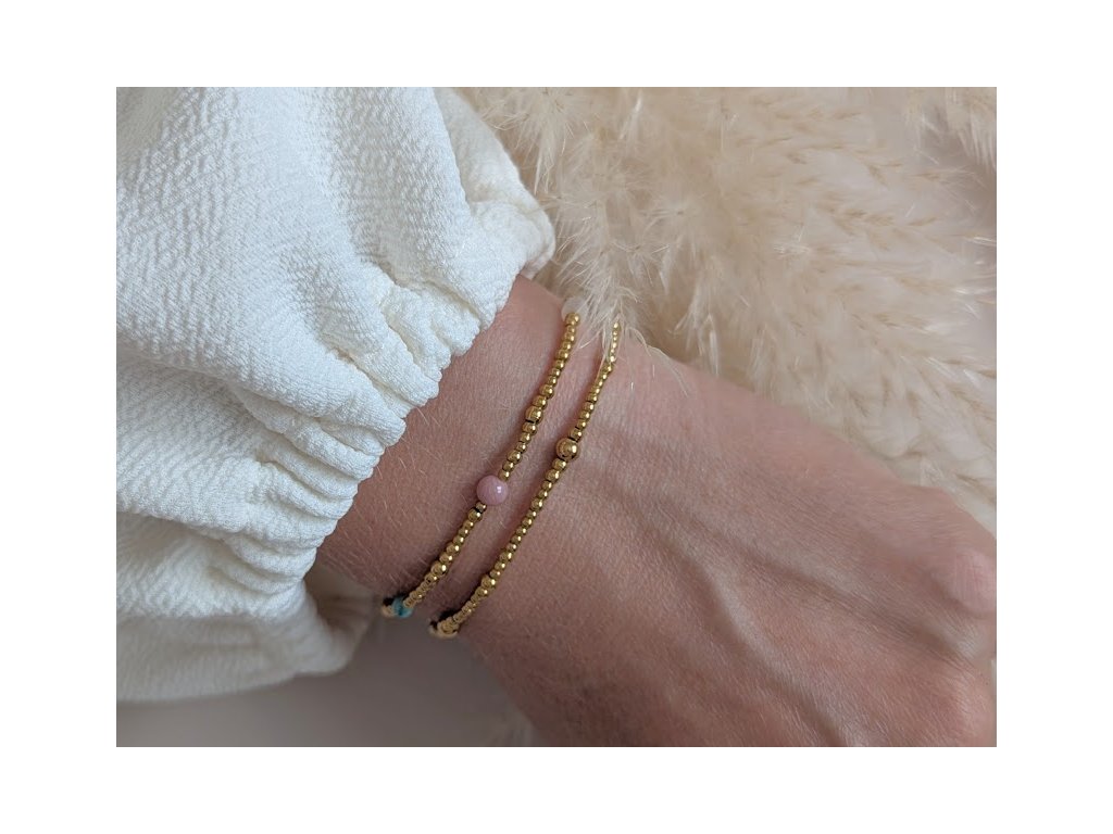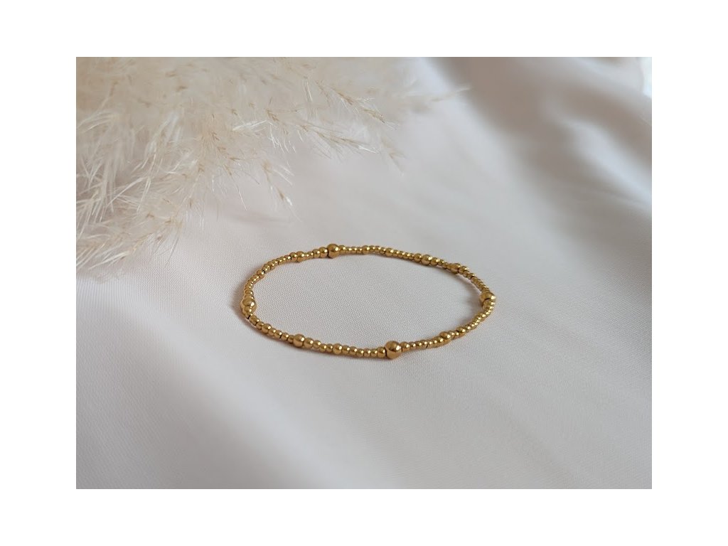 Náramek je vyrobený z korálků z pozlacené šperkařské oceli. Korálky jsou navléknuty na gumičce. V nabídce jsou varianty ve žlutém nebo růžovém zlatě nebo ve stříbrné oceli. Náramek je možné doplnit barevnými korálky. Variantu náramku uved'te, prosím, do poznámky před odesláním objednávky. Nejběžnější dámská velikost je 17cm.
