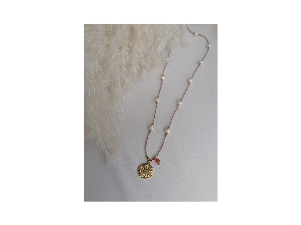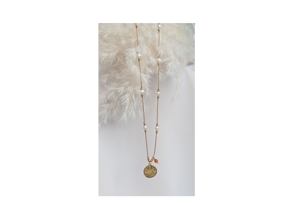 Provázkový náhrdelník je vyrobený z hedvábí, říčních perel a broušeného karneolu a z doplňků z pozlacené šperkařské oceli žlutým zlatem. V nabídce je i stříbrná varianta s korálky ze stříbra Ag 925/1000 a z přívěsku a zapínání ze stříbrné oceli. Na zapínání je přidán prodlužovací řetízek pro nastavení velikosti.