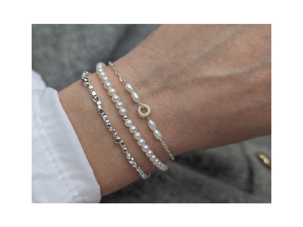 Náramek je vyrobený z řetízku z pozlacené šperkařské oceli růžovým nebo žlutým zlatem, z karma kroužku ze stříbra Ag 925/1000 pozlaceného 18k růžovým zlatem nebo 24k žlutým zlatem a říčních perliček,