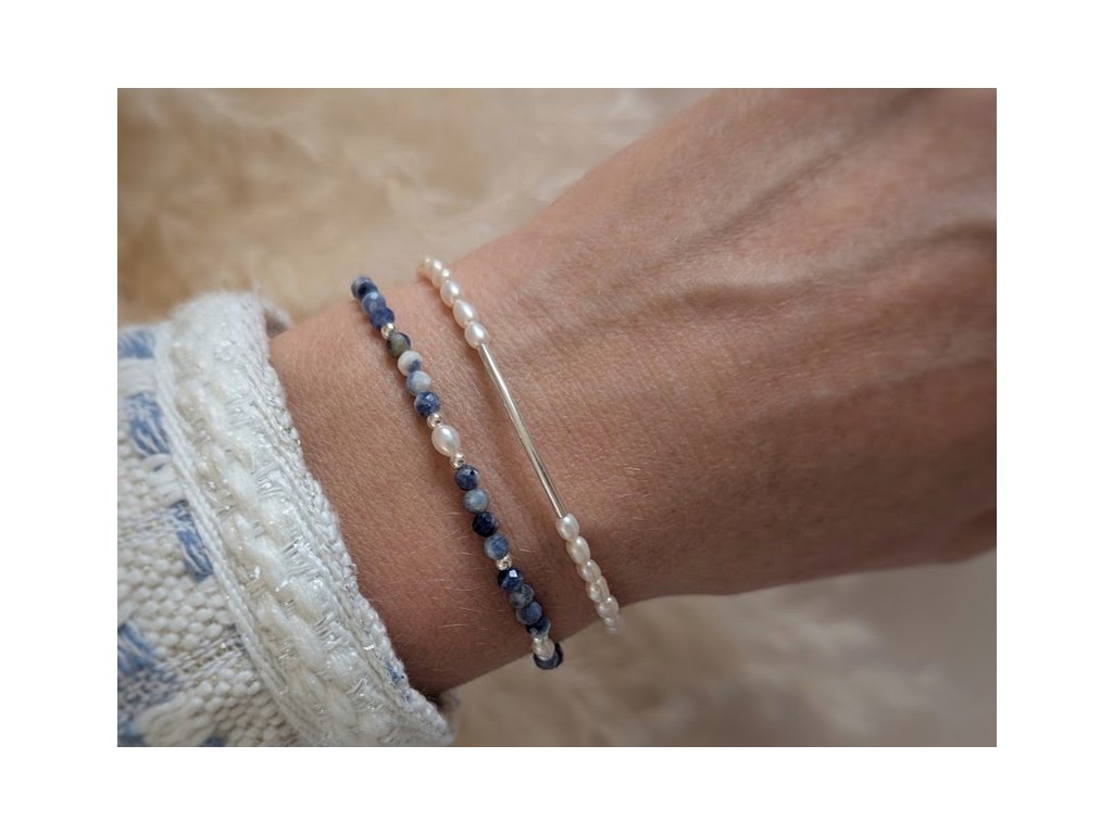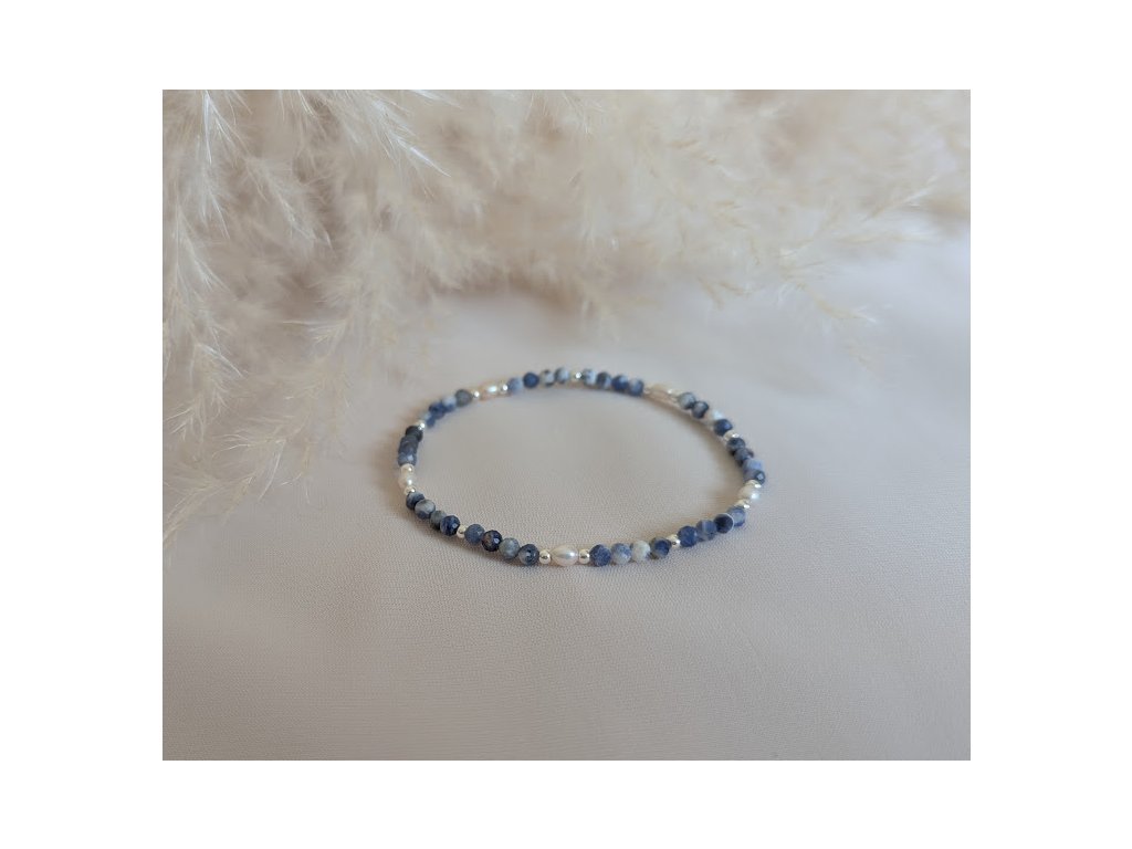 Náramek je vyrobený z broušeného sodalitu o velikosti 3-4mm, říčních perel a korálků ze šperkařské oceli. Náramek je na gumičce. Nejběžnější dámská velikost je 17cm.