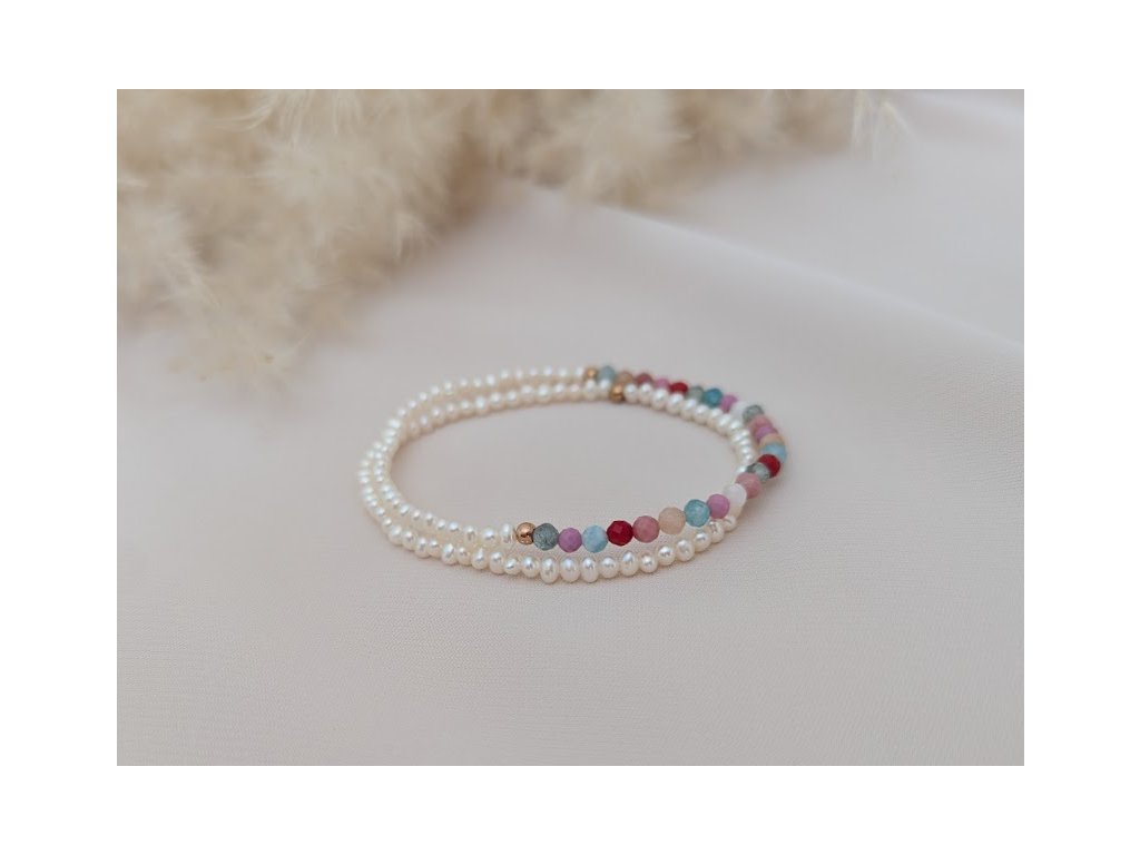 Náramek je vyrobený ze sladkovodních perel a vybraných broušených minerálů o velikosti cca 3mm a z korálků z pozlacené šperkařské oceli. V nabídce jsou varianty ve žlutém nebo růžovém zlatě nebo stříbrné oceli. Náramek je na gumičce. Nejběžnější dámská velikost je 17cm. Pokud si přejete náramek s jinými minerály, můžete to uvést do poznámky před odesláním objednávky.