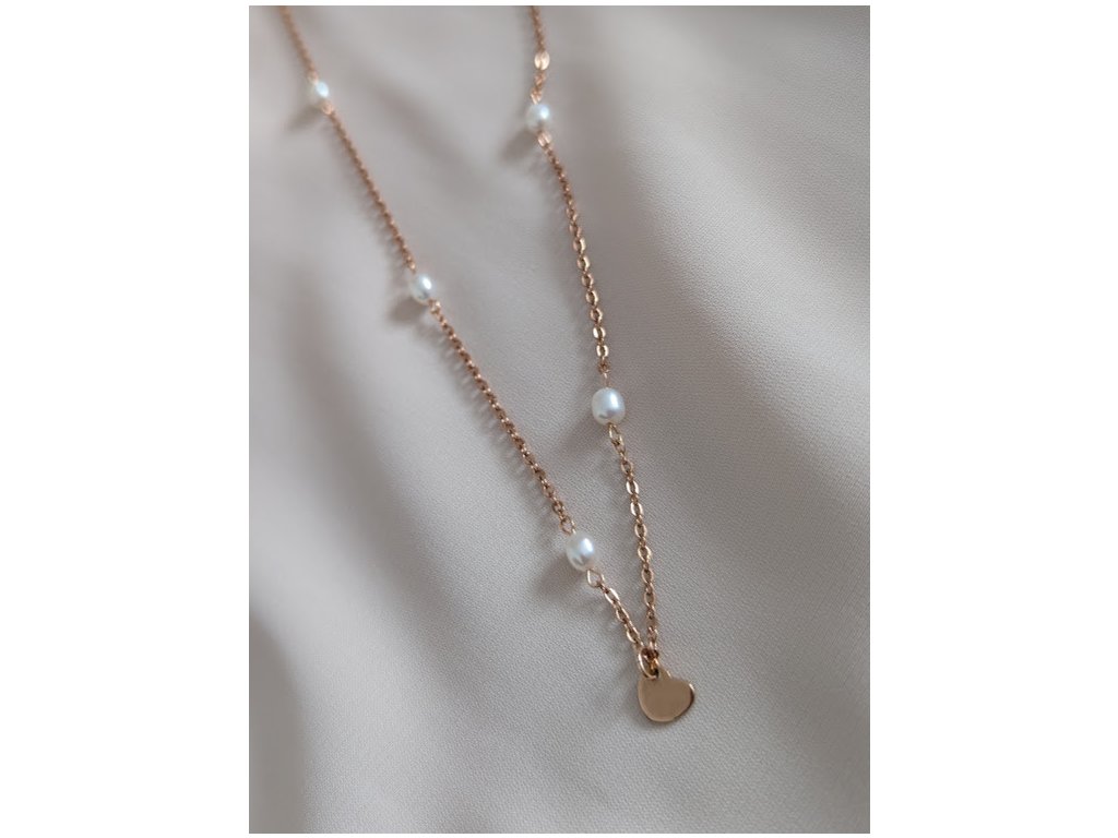 Řetízek je vyroben z pozlacené šperkařské oceli růžovým zlatem a říčních perel. Dostupné jsou i varianty v oceli pozlacené žlutým zlatem nebo ve stříbrné oceli.